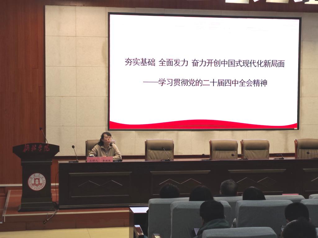 为深入学习贯彻党的二十届四中全会精神,将全校师生思想行动统一到党中央决策部署上来,根据学校党委宣讲工作安排,12月4日下午,榆林学院机关党委联合教育学院党总支、新能源学院党总支共同举办专题宣讲会。马克思主义学院副教授李飒飒以《夯实基础 全面发力 奋力开创中国式现代化新局面》为题作宣讲报告,校党委委员、副校长姚学慧出席并讲话,三部门全体党员、师生代表参加学习。